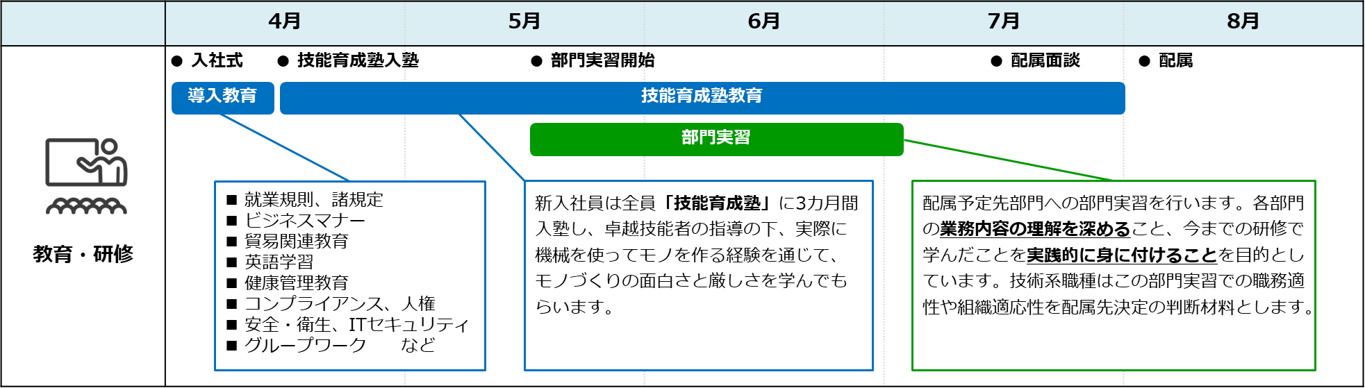 また、部門実習では開発部門や設計部門などの配属予定先部署や関連部署をローテーションし、コストに関する考え方や商品知識を学び、実習を通じて先輩社員や上司とのコミュニケーションをとることで社内の人間関係を徐々に構築していきます。