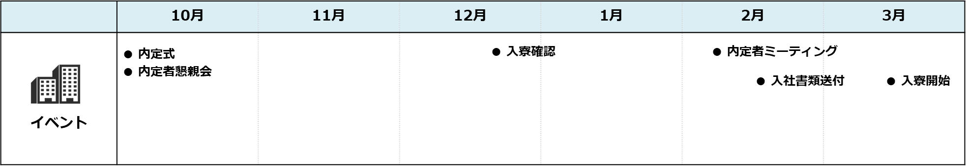 10月には内定式と内定者懇親会を行っています。さらに、基本的なビジネスマナーなどを入社までの時間に任意で学んでもらえるよう、内定者を対象としたe-ラーニングを導入しています。